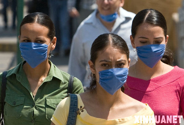 4月26日,幾名墨西哥城市民戴著口罩走在市中心的路上。當日,墨西哥城市長馬賽洛·埃布拉德宣布,該市在最近24小時內有5名豬流感疑似患者死亡,致使首都的豬流感疑似患者死亡總人數升至15人。墨西哥城市政府臨時決定追加發放100萬只免費口罩。新華社發(戴維攝)
