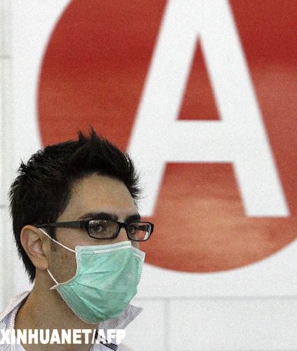 4月27日,在西班牙巴塞羅那,一名來自墨西哥的乘客戴著口罩抵達巴塞羅那機場。西班牙衛生部27日確認該國第一例人感染豬流感病例。 新華社/法新