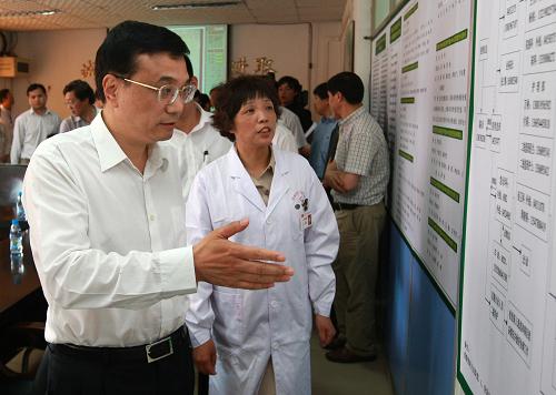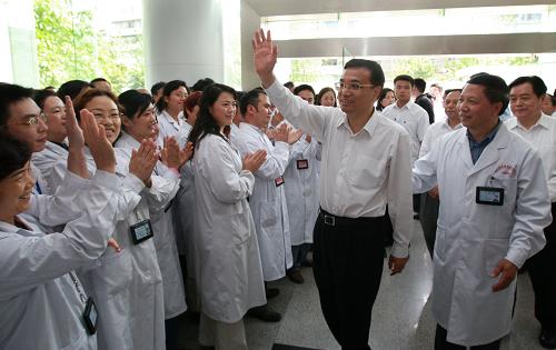5月11日,正在四川考察工作的中共中央政治局常委、國務院副總理李克強受胡錦濤總書記、溫家寶總理委托,代表黨中央、國務院,到醫院看望甲型H1N1流感患者、醫務人員和接受醫學觀察的人員,轉達胡錦濤總書記、溫家寶總理的關切和問候,并聽取四川省和成都市防控情況匯報,考察治療、預防和控制工作。這是李克強看望四川省疾病預防控制中心的醫務人員。 新華社記者 龐興雷 攝