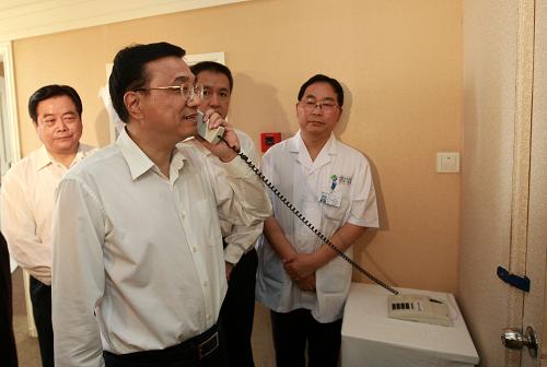 5月11日,正在四川考察工作的中共中央政治局常委、國務院副總理李克強受胡錦濤總書記、溫家寶總理委托,代表黨中央、國務院,到醫院看望甲型H1N1流感患者、醫務人員和接受醫學觀察的人員,轉達胡錦濤總書記、溫家寶總理的關切和問候,并聽取四川省和成都市防控情況匯報,考察治療、預防和控制工作。這是李克強在成都市傳染病醫院觀看傳染病患者收治流程。 新華社記者 龐興雷 攝