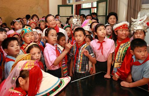 孩子們齊聲唱起歌曲《好大的家》,溫家寶和大家一起打著拍子唱起來,嘹亮的歌聲飛出禮堂,飄向遠方……