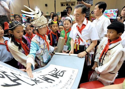這是一位少數民族少年兒童向溫家寶贈送書法作品。新華社記者 馬占成 攝