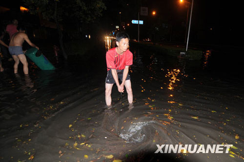 6月7日晚上,市民在柳州市西環(huán)路疏通下水道。 6月7日晚,廣西柳州市遭遇暴雨天氣,當(dāng)?shù)貧庀蟛块T于22時49分發(fā)布暴雨橙色預(yù)警信號。暴雨造成一些路段積水,給市民帶來不便。新華社發(fā)