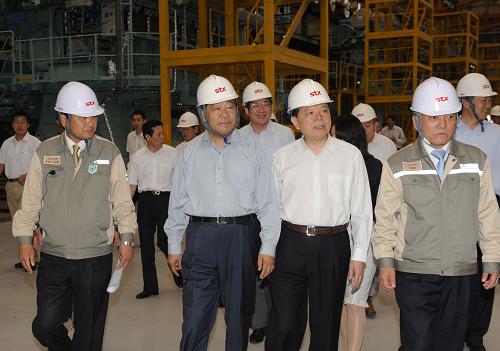 6月11日至15日,中共中央政治局常委、全國政協主席賈慶林在遼寧調研。這是6月12日,賈慶林在大連長興島臨港工業區STX集團發動機工廠視察發動機生產情況。新華社記者 黃敬文 攝