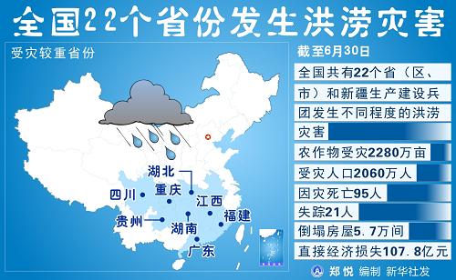 記者從國家防汛抗旱總指揮部辦公室獲悉:截至6月30日統計,全國共有22個省(區、市)和新疆生產建設兵團發生不同程度的洪澇災害,農作物受災2280萬畝,受災人口2060萬人,因災死亡95人、失蹤21人,倒塌房屋5.7萬間,直接經濟損失107.8億元。其中湖南、廣東、湖北、貴州、四川、福建、江西、重慶8省市受災較重,山洪災害造成的死亡人數占全國洪澇災害死亡人數的80%以上。
