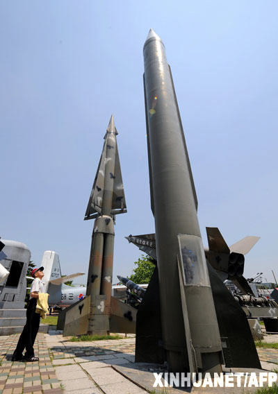 這張5月27日拍攝的資料照片顯示,一名韓國(guó)人在首都首爾觀看一枚朝鮮導(dǎo)彈(右)和一些韓國(guó)導(dǎo)彈的模型。新華社/法新
