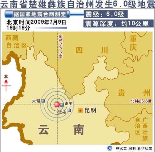 新華社北京7月9日電(記者衛敏麗)據國家地震臺網測定,7月9日19時19分,云南省楚雄彝族自治州姚安縣發生6.0級地震,震源深度約10公里。此次地震震中位于姚安縣官屯鄉,震中距縣城約16公里,大理、麗江、昆明等地震感強烈。