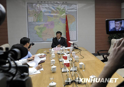 7月18日,新疆維吾爾自治區(qū)主席努爾·白克力(中)在烏魯木齊市接受境外媒體采訪。新華社記者趙戈攝