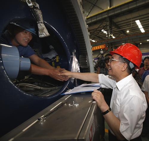 7月25日至27日,中共中央政治局常委、國務院總理溫家寶到吉林考察。這是7月25日,溫家寶在地處吉林市的明陽大通風電技術有限公司風力發電機總裝車間與工人握手、交談。 新華社記者 姚大偉 攝