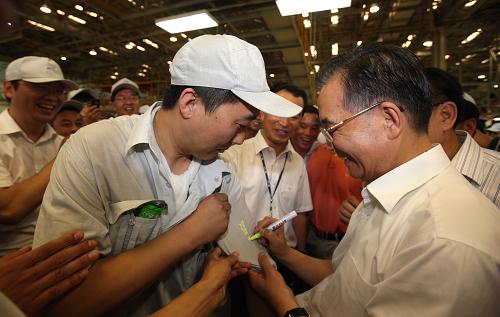 7月25日至27日,中共中央政治局常委、國務院總理溫家寶到吉林考察。這是7月26日,溫家寶在一汽轎車股份有限公司考察時應一位工人的要求,在他的工作服上簽名留念。新華社記者 姚大偉 攝