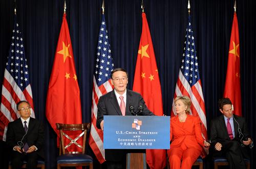 7月28日,中國國務院副總理王岐山(前)在美國首都華盛頓發表首輪中美戰略與經濟對話閉幕聲明。當天,首輪中美戰略與經濟對話在華盛頓閉幕,中國國家主席胡錦濤特別代表、國務院副總理王岐山和國務委員戴秉國與美國總統巴拉克·奧巴馬特別代表、國務卿希拉里·克林頓和財政部長蒂莫西·蓋特納共同主持了為期兩天的對話。新華社記者 申宏 攝
