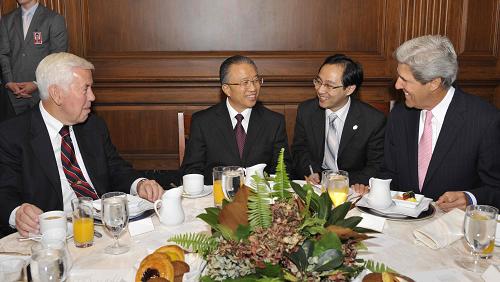 7月29日,中國國務(wù)委員戴秉國(左二)在美國華盛頓與美國國會參議員克里(右一)、盧格(左一)等共進(jìn)早餐。 新華社記者 張巖 攝