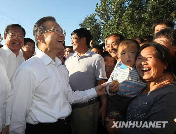 28日至29日,溫家寶來到內(nèi)蒙古自治區(qū)赤峰市敖漢旗、通遼市奈曼旗,這里旱災發(fā)生范圍廣、面積大、程度重。他深入田間地頭,實地察看農(nóng)作物受災和當?shù)乜购登闆r,走訪農(nóng)戶,了解人畜飲水和口糧供應情況,代表黨中央、國務院看望慰問災區(qū)群眾,檢查指導抗旱救災工作。