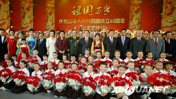 9月29日晚,“祖國萬歲——慶祝中華人民共和國成立60周年大型文藝晚會”在北京舉行。中共中央政治局常委李長春出席觀看。這是晚會結束后,李長春與演職人員合影。新華社記者 姚大偉 攝
