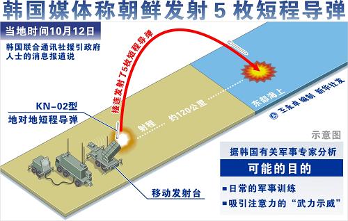 新華網首爾10月12日電(記者 班威 姬新龍)據韓國媒體報道,朝鮮12日在東海岸地區發射了5枚移動式地對地短程導彈。