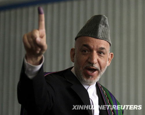 2009年8月20日,在阿富汗首都喀布爾,阿現(xiàn)任總統(tǒng)卡爾扎伊投票后展示手指上的墨跡。這是自塔利班政權(quán)倒臺(tái)以來(lái)阿富汗舉行的第二屆總統(tǒng)選舉。 新華社/路透