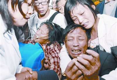 現場,有些失控。工作人員死死拉住陳崇香、涂月熙,并說:“節哀,節哀!”突然,傷心欲絕、痛哭中吐不過氣來的涂月熙昏倒在地,正在追悼會大廳負責醫療的荊州市醫護人員,趕緊過來給她輸氧搶救。