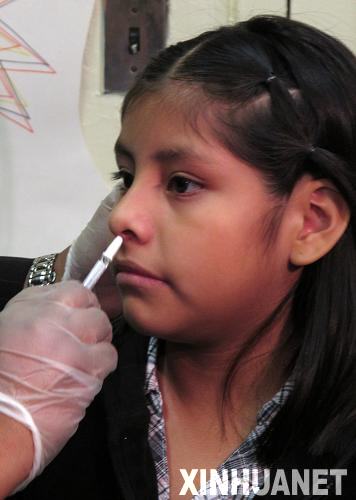 2009年10月28日,在美國紐約布魯克林區(qū)的第157公立小學(xué),一名學(xué)生正在接種甲型流感疫苗鼻腔噴劑。新華社記者劉欣攝