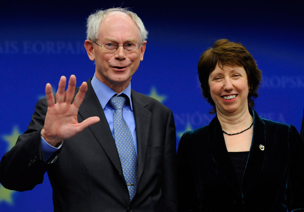 11月19日,布魯塞爾,歐洲理事會首位常任主席范龍佩、歐盟外交和安全政策高級代表凱瑟琳·阿什頓出席記者會。