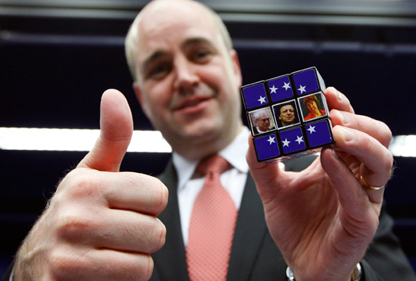 歐盟輪值主席、瑞典首相賴因費爾特展示一個飾有范龍佩、巴羅佐和阿什頓頭像的魔方。