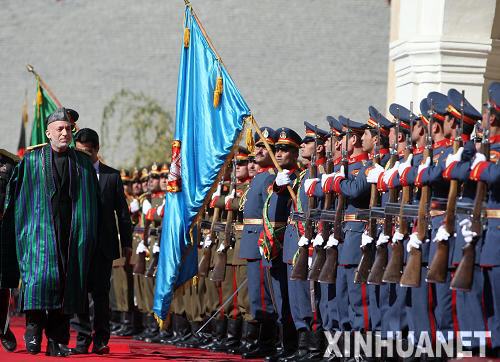 11月19日,在阿富汗首都喀布爾的阿總統(tǒng)府,阿富汗總統(tǒng)卡爾扎伊(左)在宣誓就職前檢閱儀仗隊(duì)。當(dāng)天,卡爾扎伊宣誓就職,開始其第二個(gè)5年的總統(tǒng)任期。新華社記者扎比攝