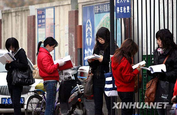 11月29日,考生在上海徐匯區零陵中學考點外抓緊時間看書復習。當日,2010年度中央機關及其直屬機構公務員錄用考試公共科目筆試在全國各省會城市、自治區首府、直轄市和部分較大的城市同時舉行,預計將有100萬人參加考試。2010年度中央機關及其直屬機構公務員錄用考試,共有130多個中央機關及其直屬機構和參照公務員法管理的單位面向社會公開招考,計劃招收1.5萬余人。新華社記者 劉穎 攝
