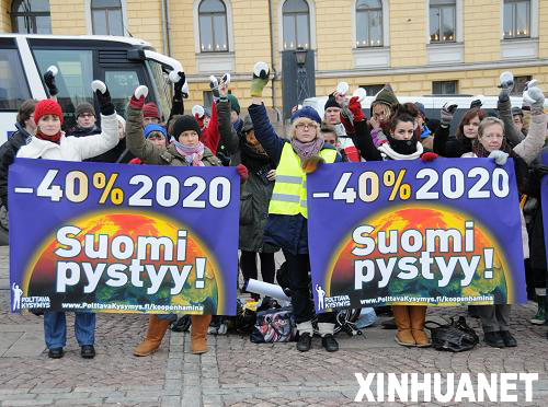 12月12日,近百名民眾在芬蘭首都赫爾辛基市中心廣場拉響警報器,向人們發出氣候變化的警報。當天,在哥本哈根舉行聯合國氣候變化大會之際,芬蘭全國14個城市同時舉行由“芬蘭地球之友”等民間組織發起的環保示威集會,要求聯合國氣候變化大會達成一項具有法律效力的協議,使發達國家承擔起到2020年將溫室氣體排放量在1990年的基礎上減少40%的義務,并每年至少向發展中國家提供1100億歐元的氣候援助資金。新華社記者趙長春攝