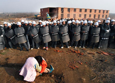 2009年12月17日,武漢市洪山區公安、城管、規劃等部門展開聯合行動,組織800多名執法人員強制拆除左嶺鎮3個村近4萬平方米的違章建筑時,遇到了抗拒拆遷的村民,強拆隊伍就用盾牌組成人墻將人隔離在外。