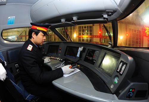 12月26日凌晨,出庫司機準備將首列動車組從武漢動車基地開出庫房,進入武漢火車站,執行首次武漢到廣州的高速運營。新華社記者 程敏 攝