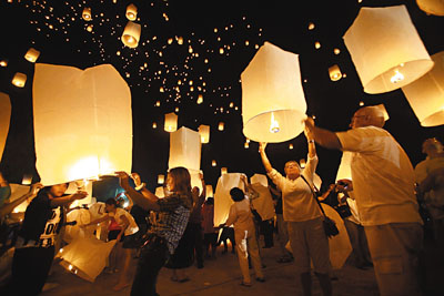 在泰國,人們點亮天燈祈禱平安