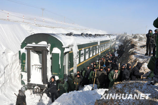 車體一點點地被積雪吞噬,搶險隊員們剛剛搶通的線路眨眼間又被暴風雪掩埋。列車受困的位置恰好處在一個洼地處,暴風雪壘起的雪墻與車身之間只剩下了一條只能容下一人行走的小窄縫,寬度不斷地在縮小。搶險隊員只有采取單邊接力,兩頭推進的方式,一點點擴大雪墻與車廂內旅客的距離。列車上的燃料逐步減少,隨時面臨停水、停電、停暖,1400余名旅客的生命安全受到了嚴重威脅。