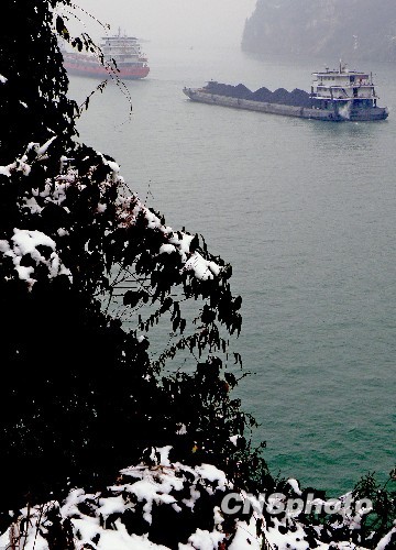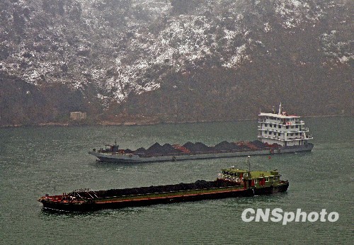 2010年1月6日,湖北宜昌,運煤炭的貨船經過積雪的長江西陵峽。連日來,北方與華東、華中地區出現暴雪天氣,湖南、湖北、江西、河南等省份普遍出現電煤短缺局面,上海、江蘇、湖北等地局部時段已出現拉閘限電情況。 中新社發 劉君鳳 攝