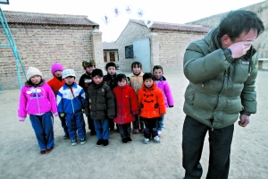 去年12月22日上午9點(diǎn),甘肅省渭源縣,代課老師蘇漢偉在和自己所帶的一年級(jí)10名學(xué)生照全家福時(shí)抹起了眼淚。他得知當(dāng)?shù)卣畬⒃?009年年底前清退完所有的代課老師。楊登峰 攝