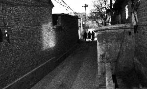 昨晚,3名警察從案發院子走出。 記者 秦斌 攝