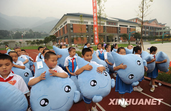 2009年9月1日,在都江堰市北街小學新校區,師生們舉行了開學典禮。當日,都江堰市災后重建竣工投入使用的48所中小學校交接儀式暨2009年秋季開學典禮在都江堰市北街小學新校區舉行。全市7萬余名中小學生全部告別了板房學校,搬進了災后重建的永久性校園學習。 新華社記者 江宏景 攝