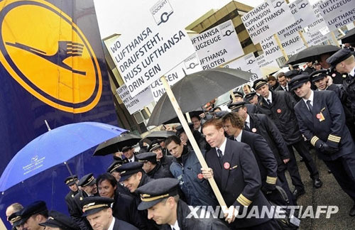 漢莎航空公司的飛行員手舉標(biāo)語參加罷工。新華社/法新
