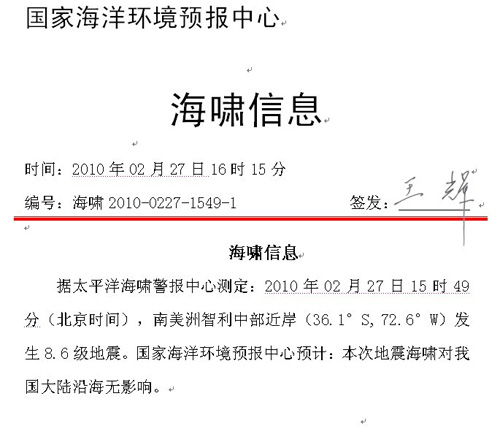 記者在國家海洋環境預報中心網站海嘯警報欄目中看到,這份編號為海嘯2010-0227-1549-1的海嘯信息是于27日16時15分發布的,簽發人為王輝。據媒體報道,王輝任國家海洋環境預報中心常務副主任。