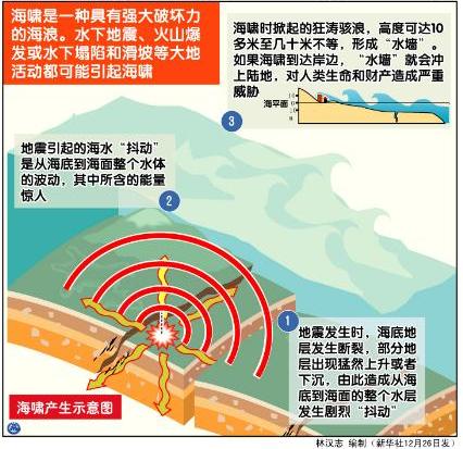 海嘯是由海底地震、火山爆發、海底滑坡等產生的破壞性海浪。在深海大洋,海嘯波以每小時800 公里以上的速度傳播,但波高卻只有幾十厘米或更小。當海嘯波移近岸邊淺水區時,波速會減慢,波高陡增,可形成十數米或更高的水墻。隨著海嘯波向陸移動,由于受海灣、海港或瀉湖等特殊地形的影響,海嘯波的高度會進一步上升。據觀測,大海嘯的波高可達30 米以上。即使波高只有3至6米的海嘯,也極具破壞力,可造成嚴重傷亡。