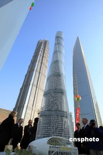2008年11月29日,中國第一高樓——“上海中心”在上海陸家嘴金融貿易區腹地開工,該超高層建筑總高度將達632米,將與毗鄰的超高層建筑“金茂大廈”、“環球金融中心”,形成“三足鼎立”美景,圖為開工儀式上,中外嘉賓搶先觀賞這一“上海新景觀”。中新社發潘索菲攝