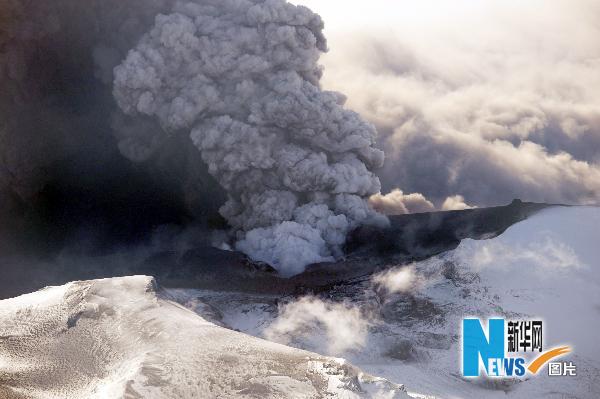 4月17日,在冰島,一名飛行員在空中拍攝噴發的火山。 新華社/法新