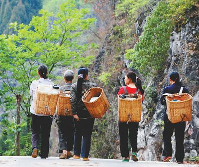 冷洞村村民背著盛水工具準備取水澆灌金銀花。