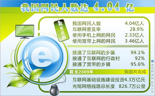 據介紹,截至2009年,我國共完成互聯網基礎設施建設投資4.3萬億元,建成光纜網絡線路總長度達826.7萬公里。目前,我國99.1%的鄉鎮和92%的行政村接通了互聯網,95.6%的鄉鎮接通了寬帶。3G網絡已基本覆蓋全國。互聯網基礎設施的完善大大促進了互聯網的普及和應用。