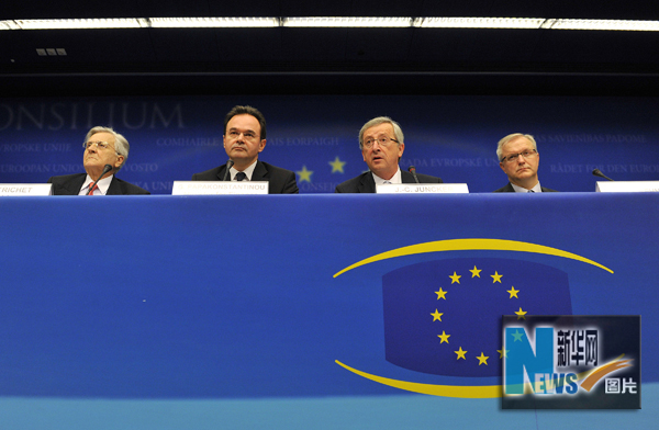5月2日,在比利時首都布魯塞爾,歐洲央行行長特里謝、希臘財政部長帕帕康斯坦季努、歐元集團主席、盧森堡首相容克及歐盟委員會負責經濟和貨幣事務的委員雷恩(從左至右)出席歐元區成員國財政部長會議后的新聞發布會。當天,歐元區財政部長同意在未來的三年內為希臘政府提供800億歐元貸款,以幫助陷入債務危機的希臘渡過難關。新華社記者武巍攝