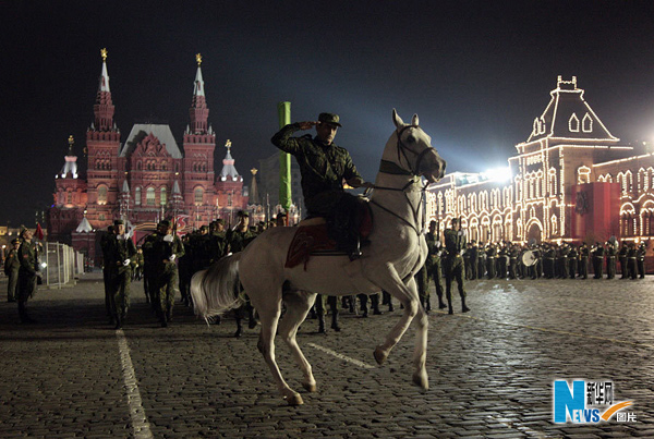 5月2日,在俄羅斯首都莫斯科的紅場,一名士兵騎馬參加閱兵式演練。今年是世界反法西斯戰(zhàn)爭勝利65周年。5月9日,俄羅斯將在多個城市舉行閱兵式和游行活動,慶祝衛(wèi)國戰(zhàn)爭勝利日。 新華社/法新