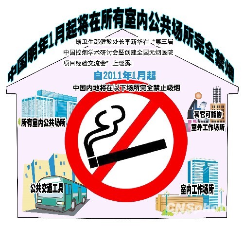 5月10日,衛(wèi)生部婦幼保健與社區(qū)衛(wèi)生司司長(zhǎng)楊青在衛(wèi)生部例行新聞發(fā)布會(huì)上指出,根據(jù)世界衛(wèi)生組織《煙草控制框架公約》要求,自2011年1月起,我國(guó)應(yīng)當(dāng)在所有室內(nèi)公共場(chǎng)所、室內(nèi)工作場(chǎng)所、公共交通工具和其他可能的室外公共場(chǎng)所完全禁止吸煙。