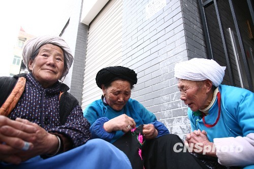 汶川地震兩周年臨近之際,在四川地震重災區,新修住房、城鎮巷子、老齡活動中心及景觀大道都已修建完畢。圖為汶川街道旁幾位老人閑聊,閑暇之時老人仍不忘繡”羌繡”。 中新社發 張浪 攝