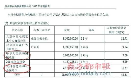 盡管貴州茅臺2010年年報早已于3月21日發布,但仍被細心的網民發現,該公司年報的“其他應收賬款前五名單位情況”中,中華人民共和國民政部、貴州省勞動和社會保障廳分居第二名和第四名,其中,民政部欠貴州茅臺500萬元,貴州社保廳欠貴州茅臺412.85萬元。