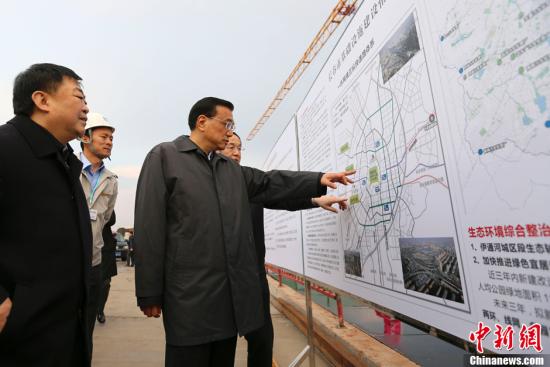 2015年4月9日,李克強考察長春南部新城綜合交通樞紐施工現場,該工程涵蓋地鐵、地下停車庫、地下商業步行系統等。總理夸贊正在作業的工人們是城市建設的功臣。中新社發 劉震 攝