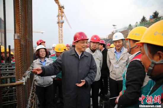 2015年4月9日,李克強考察長春南部新城綜合交通樞紐施工現場,該工程涵蓋地鐵、地下停車庫、地下商業步行系統等?偫砜滟澱谧鳂I的工人們是城市建設的功臣。中新社發 劉震 攝