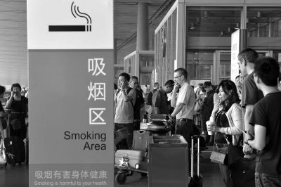 昨天,首都機場T3航站樓出發層和到達層室外分別設有三個和四個吸煙區,地上用黃線圍 起,吸煙者大多自覺站到黃線內吸煙。 京華時報記者徐曉帆攝